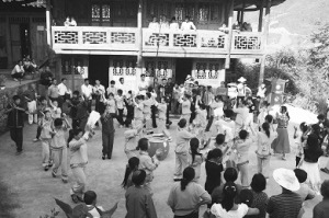 從古至今,每年的正月初九“舍巴節(jié)”(舍巴:土家語(yǔ)擺手舞的意思)、三月三“祭祖節(jié)”、“冬至?xí)?,土家人都要在擺手堂舉行盛大的祭祀活動(dòng)。農(nóng)閑時(shí)的夜晚,在農(nóng)家院壩,點(diǎn)燃熊熊篝火,男女老少在有奏的鑼鼓聲中歡快地舞蹈,盡情地歌唱。清代文人彭施鐸在《竹枝詞》中載:“福石城中錦作窩,土王宮前水生波,紅燈萬(wàn)盞人千疊,一片纏綿擺手歌。”寥寥數(shù)語(yǔ)把土家人跳擺手舞的盛況真實(shí)地展現(xiàn)出來(lái)。