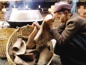 據(jù)曼滿村的傣族老人介紹,制作泡牛皮的材料是水牛皮,黃牛皮太薄是不行的。水牛皮買回家后,第一道工序是去毛。將牛皮用沸水燙后,刮盡上面的牛毛,剔掉附著的筋肉,再將牛皮煮至用竹筷稍用力可穿透為止。第二道工序是晾涼,刮去牛皮的上下兩層,將中間一層純皮切成長10厘米、寬1至2厘米的條狀,然后,將其曬成干品,放進60℃左右的油鍋內(nèi)浸泡24小時,撈出,濾油曬干,供油炸用。要吃的時候,把曬干的條狀牛皮放入熱油鍋中,文火加熱,直至牛皮像油條一樣發(fā)泡、微黃時,取出食用即可。