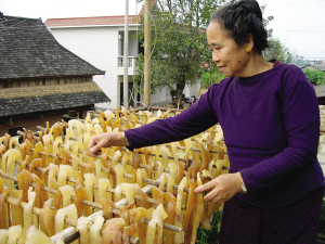 油炸牛皮,傣話叫“喃膀”,是傣家人的一項傳統(tǒng)美食。嘎灑鎮(zhèn)曼滿村是有名的泡牛皮制作村,村里的傣族老人專門生產(chǎn)泡牛皮,而曼灑村傣族老人專門銷售泡牛皮,已經(jīng)形成了一條比較默契的產(chǎn)業(yè)鏈。