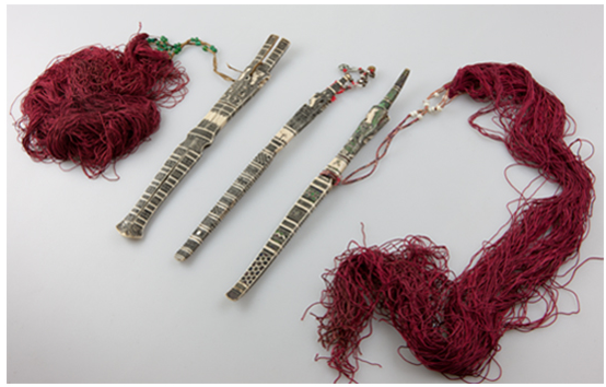 骨簪頭部以下是充滿幾何感的水波紋、山形紋、米字紋、圓形紋,留白之處有魚紋、花紋以及少許文字。文字或是雕刻者本人,或是其心愛之人。一般頭像處或中部系有幾束彩色料珠的紅纓穗飾物用以盤繞發(fā)髻上,或是以銀鈴、銀片來裝飾。