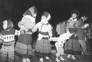 傈僳族跳舞經(jīng)常是通宵達旦,其一種說法是:由于山上居住條件差,遠遠近近村寨的人們來到了這里,主人無法提供大多數(shù)人睡覺和休息取暖場所,山上這能跳舞的半年的時間里氣候寒冷,跳著、活動著方能御寒;另一說法是:由于人們平時很難相聚在一起,人們利用這種機會盡情狂歡,青年們則通過跳舞談情說愛。