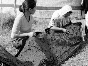 秋來春往,花落花開,瑪利亞從小女孩長成大姑娘,她的繡藝也日漸嫻熟,結(jié)繡、鉤繡、扎繡、刺繡、串珠片繡、格子架繡、十字繡……在日復(fù)一日的飛針走線中,她練就了一雙巧手和溫柔內(nèi)斂的性格?,斃麃喞C花,先勾勒花朵的輪廓,再用細的色線填滿輪廓內(nèi)的空間,由外向內(nèi),一圈一圈、一層一層,直到色彩飽滿的圖案凸現(xiàn)出來。草原上黃色的野菊、白色的蒲公英、藍色的薰衣草、紅色的刺玫,都像被擷取了精靈似的,綻放在柯爾克孜女人的繡品中,流露出她們與自然界溫暖而平和的情感交流。
