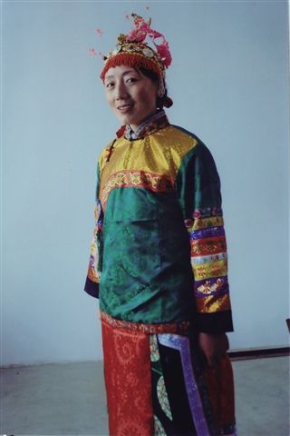 女子結(jié)婚或在節(jié)日期間的穿戴更為別致,身穿以綢緞縫制的兩袖口寬的繡花褂子,袖口鑲有七道或九道花邊,花邊上繡有各種花卉圖案,做工精細(xì),鮮亮多彩。頭戴鳳冠,土族語叫“首帕冠”,鑲著瑪瑙和珊瑚,前沿密墜細(xì)小的珍珠穗子,中間是細(xì)銀絲制成的鳳凰。戴鳳冠時還需要綴假發(fā)誓,并用長簪加固。佩戴這種頭飾,土族語叫“素不都腦達(dá)”(即索卡斗?扭達(dá)爾之音轉(zhuǎn))。