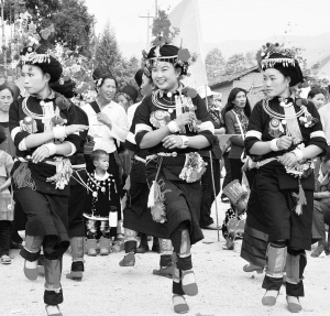 登窩羅時(shí),領(lǐng)唱的人在前,這人叫“稍干”。其他人雙手叉腰,跟著稍干唱。邊唱邊大蹲大跳,一會(huì)兒背對(duì)背,一會(huì)兒面對(duì)面。春節(jié)圍著窩羅牌坊跳,平時(shí)圍著一張擺滿(mǎn)煙酒茶果的桌子跳,意思是圍著太陽(yáng)、月亮轉(zhuǎn)。