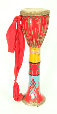 阿昌族的樂器主要有竹琴、洞簫、葫蘆簫(右圖,劉軍攝)、三月簫、銅口弦、三弦、象腳鼓(下圖,蒙哥提供)、铓鑼等。葫蘆簫是用葫蘆連接三根竹管制成的,它有7個音,音量小,音調(diào)低緩圓潤,一般晚上用。三月簫用一根竹管制成,也有7個音,它的音量大,音色細(xì)亮,多在白天使用。葫蘆簫和三月簫不僅是阿昌族人民心愛的傳統(tǒng)樂器,還是男女青年傳情示愛的媒介。