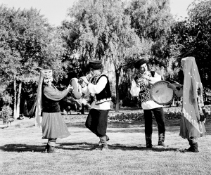 塔吉克族村民(左二、左三)在吹奏鷹笛