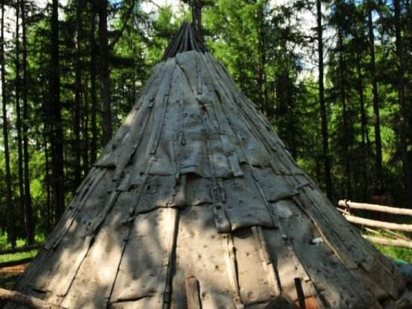 撮羅子的選址,是在地勢較高、陽光能照射到而且水和柴草就近可取的平坦之處。其蓋造方法,是用三五根約碗口粗細上有枝杈的木桿,相互交合搭成上聚下開的骨架,然后再用30根左右木桿搭在骨架之間捆綁固定,在南面(或東面)留出門,即基本成型。木桿搭起的只是“屋架”,外面還要覆蓋才能遮風(fēng)擋雨。按照季節(jié)的不同,分別用樺樹皮、草簾子和犴、狍等獸皮,做成自上而下一層壓一層的圍子,綁在木桿上,門簾則夏用草或樹條編,冬用狍皮做成。