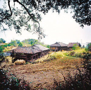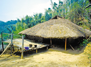 云南省潞西市三臺(tái)山鄉(xiāng)的德昂族居住分散,村寨很小,大都建在高半山上,山路行車?yán)щy。傳統(tǒng)住房為正方形干欄式竹木建筑,房屋兩層,為木柱結(jié)構(gòu)框架,竹篾編片圍墻,粗竹劈壓成自然的竹片做樓板,屋頂苫草排,當(dāng)?shù)厮追Q“草帽頂房。”