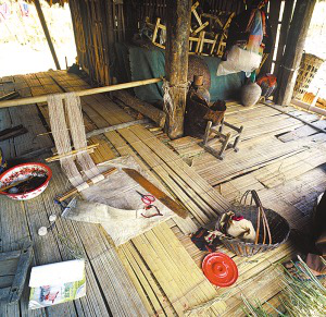 樓上住人、煮飯、貯藏糧食,樓下圈養(yǎng)牲畜。以簡(jiǎn)易板梯上下,有小廊道。室內(nèi)順梁開前后兩道門,中間的通道將屋內(nèi)分成兩部分。右側(cè)為客房,設(shè)火塘,供佛像;左側(cè)為家人臥房,以竹篾隨意分隔,無門,只擋一布簾,通風(fēng)透光。正門一邊搭曬臺(tái),用來曬糧、曬衣服和洗漱。住房一側(cè)多建有附房,用以堆柴、舂米、放置生產(chǎn)工具和雜物。