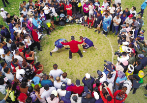 參賽隊員參加傳統(tǒng)體育項目頂杠比賽。 許叢軍攝