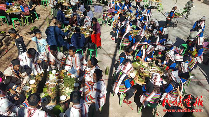 “過去過節(jié),手頭拮據(jù),經(jīng)常是三五戶人家湊錢殺一頭豬。由于物質(zhì)匱乏,節(jié)日前,男女老幼都上山挖野菜,殺豬當天,到地里砍芭蕉花,帶上柴火去寨老家里煮年飯吃,節(jié)日第三天去寨老家唱歌跳舞?!?記者聆聽著87歲基諾族老人周白講述基諾山寨的回憶。如今的他已是四世同堂,在耄耋之年能享受天倫之樂,過上幸福生活,他心存感激。節(jié)日當天老人們在村委會聚餐,席間接受年輕人的敬酒與祝福,其樂融融。