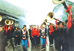 苗族姑娘們,穿鑲花邊衣褲,圍繡花抹裙,扎花絲頭巾,配銀飾花帶,可真叫艷麗。我們這些遠(yuǎn)道而來(lái)的游客受到熱烈的迎接,姑娘們用古樸的攔門對(duì)歌為我們洗塵。攔門地點(diǎn)是在村頭的小橋邊,姑娘們拉著一排民族織錦帶,滿面春風(fēng)地等待客人,兩邊苗鼓、獅子、嗩吶、甲馬長(zhǎng)號(hào)夾道歡迎。儀式按苗族風(fēng)俗,由苗族姑娘們先唱熱情的迎客苗歌,再請(qǐng)客人唱歌作客,對(duì)歌三次方過(guò)攔門第一關(guān)。緊接著她們又捧出大碗苞谷酒向客人們一一敬酒。熱情好客的姑娘們一定要待客人喝了香醇的美酒后,才示攔門結(jié)束。然后,又一路鞭炮,一路號(hào)角吹吹打打,把我們請(qǐng)進(jìn)苗寨。