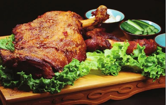 烤羊腿:將綿羊帶骨前后腿肉,配上蔥頭、芹菜和其他調(diào)料烤制而成,外酥里嫩,味道鮮美。食用時(shí)佐以黃醬、蔥段和荷頁(yè)餅食之。