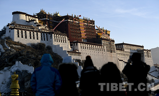 圖為2月5日,游客在藥王山觀景臺,迎接新年第一天第一縷陽光灑向布達拉宮。