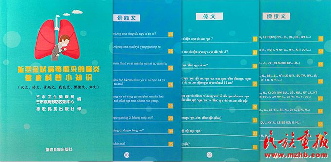 德宏民族出版社出版的《新型冠狀病毒感染的肺炎健康科普小知識》(漢傣、漢景、漢傈等對照)5000冊將免費發(fā)放至全州各鄉(xiāng)鎮(zhèn)和邊境一線窗口單位。