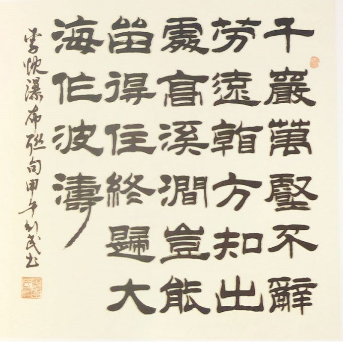 張行民的書法作品博覽眾家之長,悉心揣摩隸書之要義,領(lǐng)悟其精髓,加入其心志與感悟,漸漸形成了自己的風(fēng)格。他的作品灑脫飄逸,體骨厚重,參合有各派書體的筆意,同時(shí)又有自己個(gè)性和意境的張揚(yáng),字體端莊英武,體象收放凝度。賞其書法,總能給我們一種“渾然陣列,筋道玉骨”的美感,實(shí)屬不可多得。