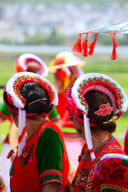 在白族女子的包頭頭飾上,蘊(yùn)含著一個(gè)大家非常熟悉的詞語(yǔ):風(fēng)花雪月。垂下的纓穗象征下關(guān)的風(fēng),艷麗的花飾象征上關(guān)的花,帽頂?shù)臐嵃资巧n山雪,彎彎的造型是洱海月,足見(jiàn)白族群眾的精巧靈思。