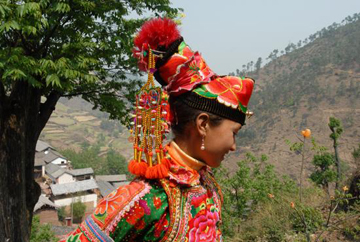 云南巍山彝族回族自治縣各民族如壯麗的織錦,將生活裝扮得五彩繽紛,充滿詩(shī)情畫(huà)意。其中特別是東山一帶的彝族服飾色彩較為豐富,款式變化多姿,并且以大量的銀制品和刺繡裝飾,制作工藝之精良,堪稱少數(shù)民族服飾一絕。以小孩帽而言,就有魚(yú)尾帽、小瓢帽、銀鼓帽、花帽和搭耳帽等數(shù)十種,名目繁多,式樣各異。帽子上都繡有花草、樹(shù)葉、龍鳳圖案,鑲嵌著閃亮的銀首飾,十分逗人喜愛(ài)。小孩的衣服式樣也很多,大多由紅、藍(lán)、綠、白幾種顏色的布料縫制而成,紅綠交織,藍(lán)白相襯,非常艷麗。如花朵一般的彝族少女通常頭戴銀鼓帽,墜耳環(huán)、身穿藍(lán)領(lǐng)褂,腰系花圍裙,下著綠彩褲,背掛圓裹背。銀鼓帽和繡花鞋做工極為精巧,全套裝飾花團(tuán)錦簇,恰似一只開(kāi)屏的孔雀。結(jié)婚后的婦女就不再戴帽子,改為結(jié)發(fā)髻,裹包頭。發(fā)髻一般呈寶塔狀,外裹黑紗和黑布包頭,發(fā)髻上戴“別子”?!皠e子”其實(shí)就是發(fā)卡,均為銀制品,分為四串,每串有兩個(gè)燈籠繡球,兩個(gè)響鈴和兩尾小魚(yú)。包頭巾外再用銀串珠、亮球飾之。上衣著右衽大襟,前短后長(zhǎng)、領(lǐng)、袖及襟邊則鑲以多層不同的金銀絲瓣或自繡花紋的多層寬窄不同的花邊。外罩齊腰藍(lán)布短領(lǐng)褂,領(lǐng)口上安裝著七個(gè)用銀鼓釘湊成五個(gè)葉子,狀如葵花形,彝語(yǔ)叫“披巴”的裝飾。領(lǐng)褂四周皆用銀鼓釘鑲邊,共四排,每排36顆。一件領(lǐng)褂上需有兩百多顆銀鼓釘,加上胸前佩戴銀制的“三須”針筒,“菱角吊”串珠和雞心型繡花荷包,整個(gè)裝飾真是銀裝素裹,分外嬌嬈。腰間系的圍腰布上,鑲嵌多層金銀絲瓣或自繡圖案的花邊。圖案有串枝蓮、牡丹花、太陽(yáng)花及鳳戲牡丹、丹鳳朝陽(yáng)等。無(wú)論未婚和已婚婦女,背上都有一個(gè)用羊毛搟制而成的圓型繡花裹背,直徑約一尺不等,內(nèi)外兩層,中可承物,上繡兩對(duì)太陽(yáng)花,一大一小,對(duì)稱排列。裹背除用作裝飾外,還可保護(hù)腰部,既有欣賞價(jià)值,又有實(shí)用價(jià)值,這在巍山彝族服飾中是最為典型的一件飾物。銀鼓帽繡有42朵小花,鑲有96顆銀鼓釘,帽頂插有花一朵或釘有櫻花一束。其帽形如金魚(yú),魚(yú)頭魚(yú)身為帽,魚(yú)尾多岔分為護(hù)頸,亦稱為“魚(yú)尾帽”。繡花鞋呈船形或鳳頭形,鞋面繡有40余朵小花,紅色中夾有40余片綠葉。如果是新娘鞋,則用紅色或粉色的軟鍛做鞋面,更為講究。