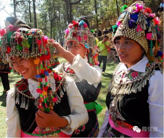 “羅羅潑支”男女服飾的特點(diǎn):“羅羅潑”男子服飾與“迷撒潑”相差無幾,一般不戴白頭巾。但是婦女的服飾相差卻很大,明顯保留著古樸高雅的南詔遺風(fēng)。頭飾由桂花、包頭、飄帶、大墜子、蜜蜂墜、芝麻鈴組成。桂花墊子在裱布上蒙黑色面料,中間訂有銀飾。包頭以黑色為主,長約2米,后鏈系于包頭,鏈子為銀制。飄帶長約4尺,黑色留花邊,兩頭訂英蘇。包頭還系有大墜子、蜜蜂墜各一對,芝麻鈴20個。領(lǐng)合由裱布黑色面料上訂芝麻玲20個圍在脖子上。圍腰的前胸部,由領(lǐng)口至腹部,左右各垂掛一條綴有串珠、針筒、響篾(口弦)一類飾品和生活用品的銀質(zhì)項(xiàng)鏈。人一走動,全身的小蘇鈴就響,聲音悅耳動聽,形象美觀大方。額頭前還圍有一塊翠綠色的“桂花綁”,綁上釘有銀質(zhì)小泡泡200多顆,羅羅潑支婦女的服飾彰顯華麗之美。