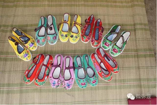 繡花鞋分大口鞋、小口鞋兩種。大口鞋大方素雅,小口鞋古樸艷麗?;佑小胺遐s梅”、“喜鵲登枝”、“獅子滾雪球“、“鳳穿牡丹”和彝族人民結(jié)婚時候,按當(dāng)?shù)仫L(fēng)俗所需必須穿的“毛邊底”等。這些花樣圖案具有不為時代變幻所動的恒久性質(zhì),蘊(yùn)藏著濃厚的傳統(tǒng)民俗文化。它給予人們的絕不僅僅是絢麗悅目的美感,還是彝民們征服自然,繁衍生息,爭取愛情和歡樂的記錄。