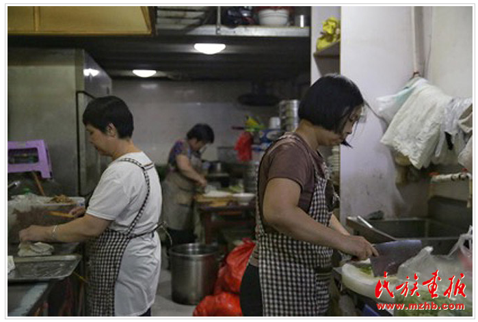 后廚忙碌的回族員工精心準(zhǔn)備著食材