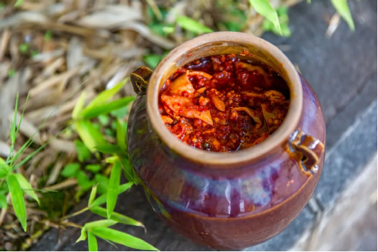 關(guān)于鶴慶的滋味,最深刻的記憶還要數(shù)那一小碟紅亮鮮香的豬肝胙。豬肝胙是用新鮮的內(nèi)臟、排骨佐以食鹽、花椒、辣椒、八角、草果等眾多香辛料研制而成的鶴慶特色美食。腌制好的豬肝胙,開壇即可聞到濃重的香氣撲鼻而來,蒸熟下飯,炒菜提鮮,豬肝胙濃郁的滋味都不會(huì)令人失望。