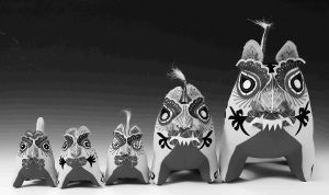 泥叫虎是山東高密的一種民間泥塑,起源于明代萬(wàn)歷初年,是形、色、聲、動(dòng)俱佳的民間工藝品,與撲灰年畫(huà)、剪紙并稱(chēng)為“高密三絕”。泥叫虎腰部由牛皮連接,擠壓其頭部和尾部后,會(huì)發(fā)出響聲,叫虎一名由此而來(lái)。河南也有叫虎,又稱(chēng)皮老虎。相較之下,山東的泥叫虎更具特色,而且在藝術(shù)風(fēng)格上更大氣,樣式憨態(tài)可掬,哨子發(fā)出的聲音也十分有趣。