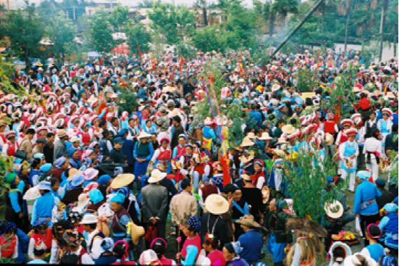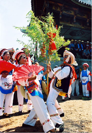 “繞三靈”活動的特點(diǎn),除了向本主神靈祈求風(fēng)調(diào)雨順的內(nèi)容之外,主要在于其歌舞活動所表現(xiàn)的男女情愛無所顧忌,放達(dá)不拘。每個歌舞隊(duì)列領(lǐng)頭者均為男女巫二人,他們以一手共執(zhí)一株齊人高的樹枝,另一手分別揮舞牦牛尾和花手巾,邊舞邊唱,引領(lǐng)著隊(duì)伍緩緩前行。樹枝上掛著紅綢系著的葫蘆,據(jù)說葫蘆象征母腹,紅綢象征陰血。他們口唱的調(diào)子稱“活恩枯”直譯為“花柳曲”,一唱一和,幽默風(fēng)趣。其后的歌舞隊(duì)列,唱的也都是充滿艷情的調(diào)子,跳的是霸王鞭和八角鼓舞,舞姿多有男女背靠背、心合心、腳勾腳等形式,無拘無束地表達(dá)著熾熱的情感。