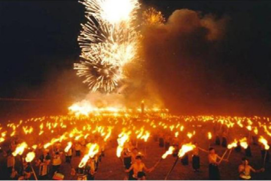 關(guān)于火把節(jié)的傳說(shuō)較多,有紀(jì)念漢代酋長(zhǎng)曼阿南之妻阿南夫人殉夫之事;有三國(guó)時(shí)群眾歡送諸葛亮南征得勝回成都之事;有南詔王皮羅閣“火燒松明樓”,柏節(jié)夫人殉節(jié)之事;還有紀(jì)念五谷之神“達(dá)撥”,祈求五谷豐登,六畜興旺之意。
