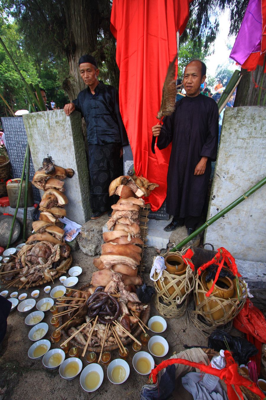 人們傳說只有醉倒了"霞神",它才能永遠(yuǎn)留在這方,才能使這里風(fēng)調(diào)雨順。當(dāng)水書先生念了最后的咒詞,祭典才在鼓樂聲和歡呼聲中結(jié)束。最后,各族系將祭肉一并聚攏,聚餐慶祝。天黑之后,人們秘密地將"霞神"收藏起來,至此,"敬霞"活動全部結(jié)束。