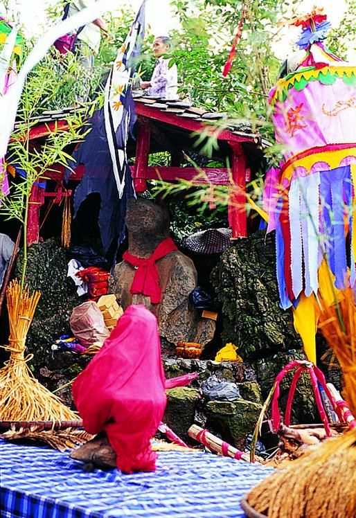 敬霞儀式在霞堂舉行。霞堂設(shè)有祭壇。壇前立著一根竹竿,竿頂上站立一只公雞。祭壇中是主祭席,其友有用松針鋪成十二個(gè)祭祀點(diǎn),由宗族各支系擺設(shè)祭品。敬霞這天,各支系由德高望眾者領(lǐng)隊(duì)。抬著豬肉、糯米飯、米酒等食品列隊(duì)進(jìn)入霞堂。一路上銅鼓、銅鑼、欽、革鼓被敲得冬嚏冬嚓地響,人們跟在后面吆喝著前進(jìn)。祭典開始,鑼鼓暄天。接著由執(zhí)壇的水書先生念讀敬霞的祝詞,內(nèi)容多為祈福禳災(zāi),期冀風(fēng)調(diào)雨順,人壽年豐之類。祝詞之后便酪酒祭之:此后,由兩個(gè)身穿白衣的小伙子抬一母豬到田壩中繞行,后面那位不時(shí)用松針刺戳豬的尾部,使它發(fā)出嗥叫聲。圍觀的人常常發(fā)出哄笑,并且盡情地用竹片屏水和撮稀泥向抬豬者灑淋過去。走過霞堂之后,抬豬者丟下母豬,故意穿進(jìn)圍觀的人群,嚇得人們四處躲避。這種逗趣結(jié)束之后,水書先生再度念讀咒詞,當(dāng)他手中的執(zhí)法彩杖一揮時(shí),飼雞者便學(xué)雞嗚,逗引竹竿頂上的公雞啼鳴。這時(shí),主祭者就向眾人高呼:等待霞神降雨來沐浴。此后,水書先生再念祝詞,又酹酒祭之。然后由各族系代表抬著"酒壇去澆灌"霞神"。人們用酒從頭澆到腳,一直澆到"霞神"們倒(象征酒醉)才算祭祀的成功。