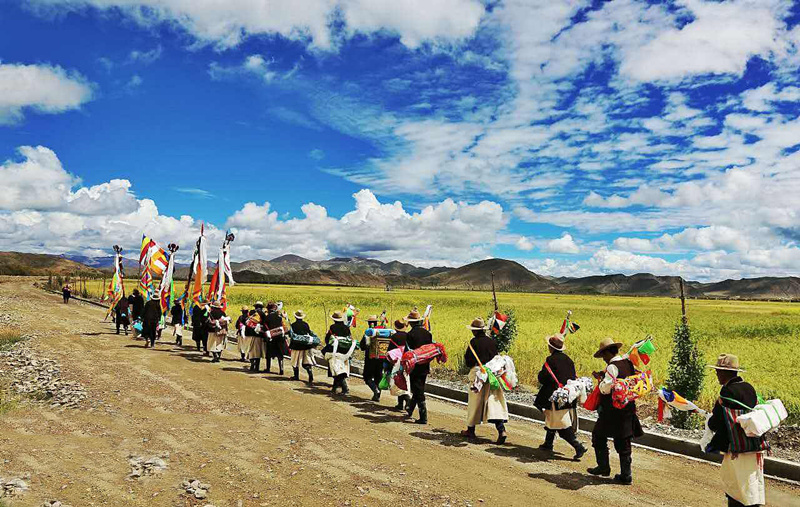 節(jié)日的第一天早晨,當(dāng)陽光撒滿金黃麥田的時(shí)候,農(nóng)民們手持麥穗圍著農(nóng)田轉(zhuǎn)圈游行,最前邊是由喇嘛和老年農(nóng)民組成的儀仗隊(duì),高舉佛像,背著經(jīng)書,吹著佛號(hào),感謝上天給人們帶來了風(fēng)調(diào)雨順的好年成。轉(zhuǎn)完麥田以后,照例要在廣場(chǎng)上舉行群眾性文娛體育活動(dòng),其中有藏戲、歌舞、跑馬、射箭、拔河等,十分熱鬧。這天,家家戶戶都要準(zhǔn)備充足的酒食,穿上最漂亮的衣服,或者在廣場(chǎng)四周的草場(chǎng)上野餐,或者在村子里邀集親朋好友宴飲。青年男女則喜歡在晚上圍著篝火跳舞,對(duì)唱情歌,直到深夜。