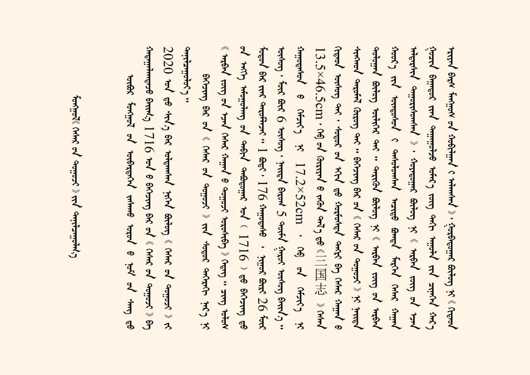 今天我們主要講述的是1716年北京木刻本蒙古文《格斯?fàn)杺鳌罚ㄈQ為《十方圣主格斯?fàn)柨珊箓鳌罚┦乔蹇滴跷迨迥辏?716)北京木刻本。梵夾裝,1卷(176葉),每頁(yè)26行,每行6個(gè)字,約5萬(wàn)多字,頁(yè)面高17.2cm、寬52cm,版框高13.5cm、寬46.5cm。版框左側(cè)有漢文《三國(guó)志》三字,首頁(yè)刻有朱印佛像。