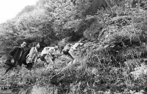 教師楊紹書(shū)和學(xué)生們?cè)谘卤谏系男÷沸凶摺?/span>