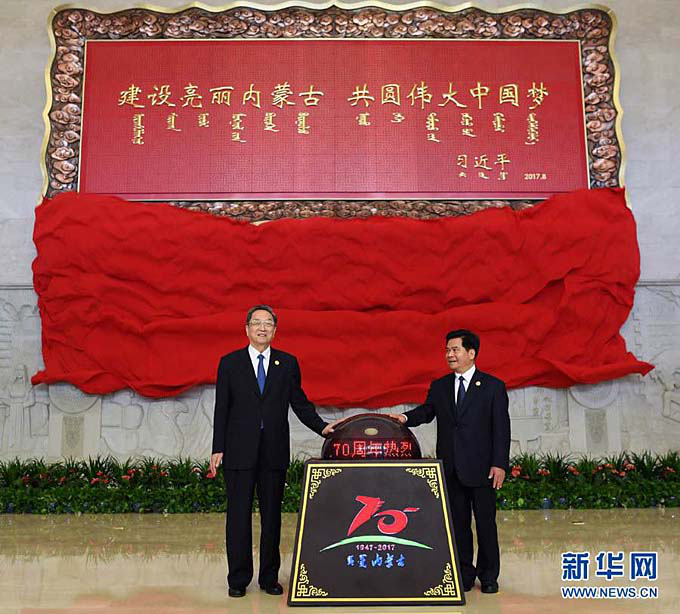 70年來,在黨中央高度重視、關(guān)心關(guān)懷下,內(nèi)蒙古各族人民在革命、建設(shè)和改革的各個(gè)歷史時(shí)期,創(chuàng)造了一個(gè)又一個(gè)人間奇跡,萬(wàn)里草原發(fā)生了翻天覆地的歷史巨變。圖為8月7日,中共中央政治局常委、全國(guó)政協(xié)主席、中央代表團(tuán)團(tuán)長(zhǎng)俞正聲率中央代表團(tuán)出席向內(nèi)蒙古自治區(qū)贈(zèng)送紀(jì)念品儀式,俞正聲和內(nèi)蒙古自治區(qū)黨委書記、人大常委會(huì)主任李紀(jì)恒一同為習(xí)近平總書記題詞賀匾揭幕(新華網(wǎng))