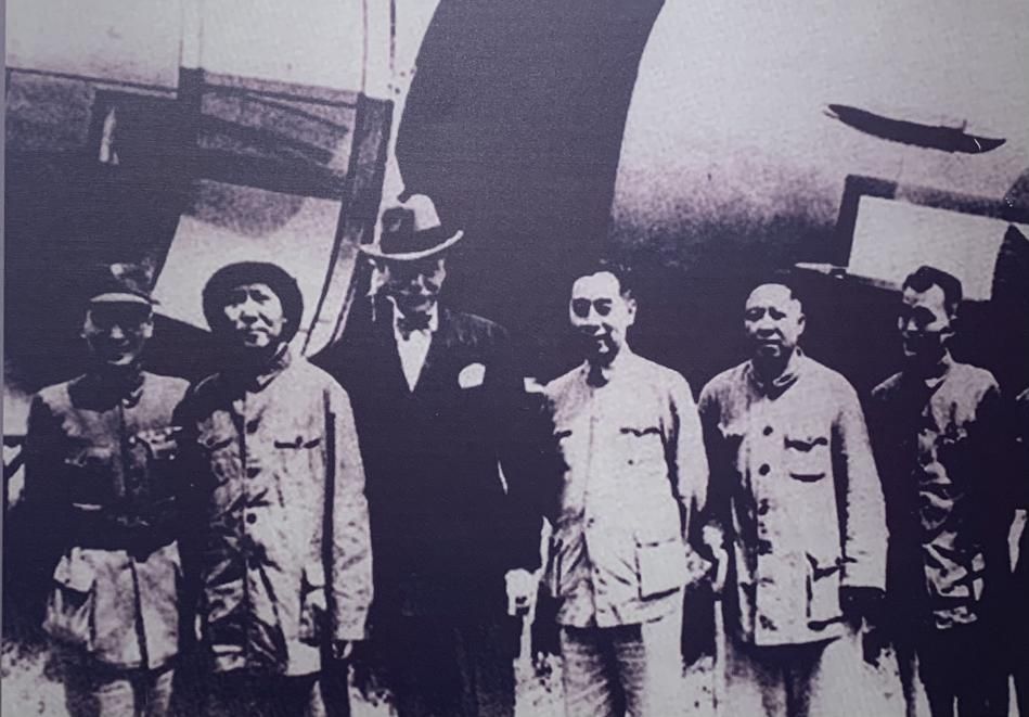 1945年,中共代表團(tuán)在赫爾利(美國(guó)駐中國(guó)大使)、張治中的陪同下臨行前在延安機(jī)場(chǎng)合影,左起為張治中、毛澤東、赫爾利、周恩來(lái)、王若飛、胡喬木。(許覬佳攝于貴陽(yáng)市達(dá)德學(xué)校舊址)