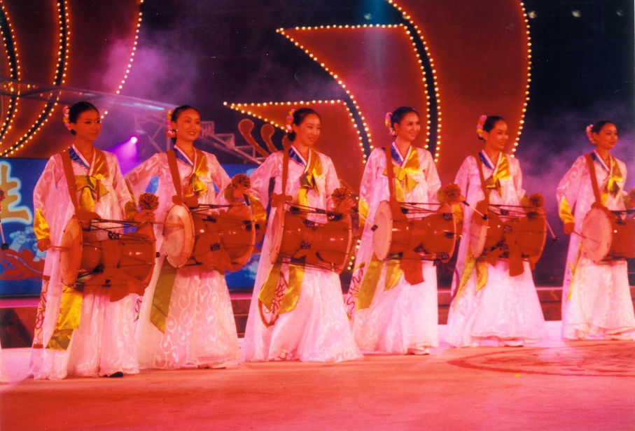 扇舞:表演者多為女性,需持花扇表演。源于古代巫女活動(dòng)及民俗活動(dòng)中的扇子表演,后發(fā)展成為單扇舞、雙扇舞兩種形式。扇舞有持一把或兩把扇具的不同形式,它具有朝鮮族特有的節(jié)奏、含而不露的內(nèi)在情緒、曲線性的律動(dòng)和自由自在的表演,隨著隊(duì)形的不斷變化,舞者將手中的扇具可組合成豐富多樣的圖案和造型。