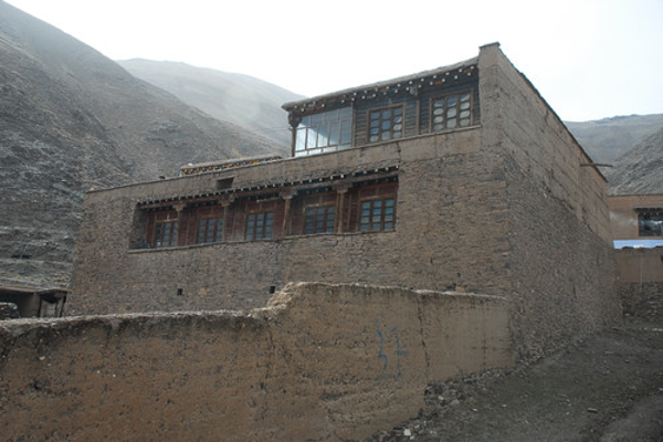 “碉院”則是一組較大的綜合性建筑,一般三層,局部四層,平面為四全院式,中間有較大的天井內(nèi)院,設(shè)小花壇,可種樹(shù)木花卉。內(nèi)院四周設(shè)回廊,石砌外墻用全封閉,除了門(mén)洞,墻上開(kāi)少量小窗。底層為牲畜圈、雜用房;二層多為倉(cāng)庫(kù)、接待房、傭工房等;三層為臥室、廚房和糧倉(cāng)、珍寶庫(kù);四層為經(jīng)堂、佛堂、經(jīng)書(shū)庫(kù)。有的在外墻女兒墻部分刷以黑色或棕色圓珠圖案,窗上檐一層或二層方椽挑出,作為傳統(tǒng)式藏窗形式,豐富了立面,改變了石墻面之笨拙感。