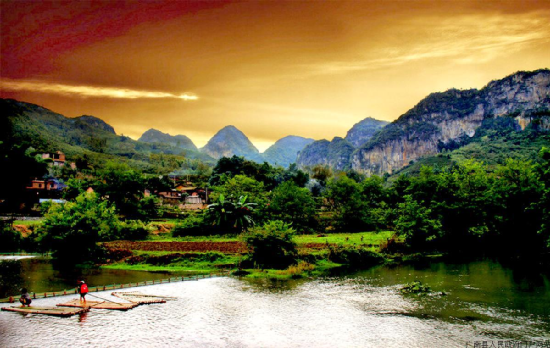 壩美,為壯語譯漢語為:壩—沖口,美—樹 ,因居住的沖口樹木多而得名。壩美村位于珠江流域西江水系馱娘江上游的阿科河畔。屬喀斯特地貌,區(qū)域內(nèi)山峰奇特,河谷幽美,阡陌縱橫,河流山泉蜿蜒奔流,溶洞層疊散布在山體峰內(nèi),冬無嚴(yán)寒,夏不酷暑,氣候宜人。因四面環(huán)山,不通公路,進(jìn)出寨子主要靠村前村后兩個天然的石灰溶巖水洞,村民們要摸著巖壁趟水、撐竹筏、劃獨(dú)木舟、坐小船,經(jīng)過950米長的幽暗的“出水洞”和680米長的“湯拿洞”才能進(jìn)出。由于地處偏僻,交通不便,基本不與外界交往,多年來壩美村長時期與外世隔絕。壩美村水源豐富,氣候溫和,自然生態(tài)環(huán)境未被污染,負(fù)氧離子質(zhì)數(shù)高出城市數(shù)倍,游人在此休憩,心曠神怡,是一個溫濕潤,四季宜人的旅游勝地。就生態(tài)環(huán)境和歷史淵源來說,《桃花源記》問世1500多年,只聞其名,不見其實(shí)。相傳除唐代確認(rèn)湖南省桃源縣的桃源洞為其原型外,目前全國就有冠名“世外桃源”的地名16個之多。而今天的壩美,不僅十分相似,而且還神似東晉文學(xué)家陶淵明筆下所描寫的“林盡水源,便得一山。山有小口,仿佛若有光;便舍船從口入……土地平曠,屋舍儼然,有良田美池桑竹之屬;阡陌交通,雞犬相聞……”的世外桃源。而且在當(dāng)?shù)卮迕裰杏性S多歷史傳說:北宋皇祐四年(公元1052年),壯族起義領(lǐng)袖儂智高在邕州(南寧)昆侖關(guān)被狄青打敗后,退入以其繼父儂夏卿為首領(lǐng)的特磨道(廣南)后,至和二年(1055年),宋朝廷又派楊文廣領(lǐng)兵進(jìn)剿,儂智高在突出重圍轉(zhuǎn)至阿科(今廣南縣壩美鎮(zhèn)治所)與宋軍周旋,終因寡不敵眾而離開阿科轉(zhuǎn)戰(zhàn)于丘北、開遠(yuǎn)、蒙自、元江等地,后到大理不知所終。