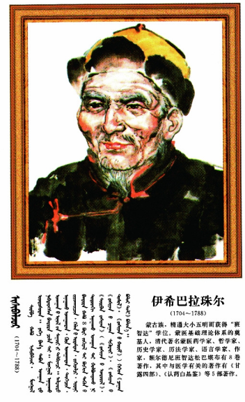 伊希巴拉珠爾(1704~1788),蒙古族,一名也協(xié)班覺、額爾德尼班智達(dá)·松巴堪布,蒙古衛(wèi)拉特人,著名蒙醫(yī)學(xué)家、文學(xué)家、天文學(xué)家哲學(xué)家。一生著作豐厚,其中對完善蒙醫(yī)理論體系有重要影響的著作有《甘露之泉》、《白露醫(yī)法從新》、《甘露點(diǎn)滴》、《甘露匯集》和《認(rèn)藥水晶鑒》,在這些著作中他將藏醫(yī)學(xué)理論與蒙古人的體質(zhì)、生活習(xí)俗、居住地區(qū)的地理、氣候條件等具體實(shí)際結(jié)合在一起,進(jìn)行創(chuàng)造性的理論研究,不僅豐富了臨床實(shí)踐的內(nèi)容,而且補(bǔ)充和完善了蒙醫(yī)學(xué)的理論體系,他將傳統(tǒng)蒙醫(yī)學(xué)“寒熱理論”與《四部醫(yī)典》中關(guān)于寒熱病理論的闡述進(jìn)行有機(jī)結(jié)合,使之成為近代蒙醫(yī)學(xué)病性辯證的總綱,同時(shí),他也闡述了將六基癥作為病因鑒別診斷的核心及其臨床表現(xiàn),使“六基癥”學(xué)說從理論到實(shí)踐都獲得了比較系統(tǒng)的發(fā)展。占布拉道爾吉是19世紀(jì)著名的蒙藥學(xué)家,他編著的《蒙藥正典》(又名嗚嗚蒙藥圖鑒)共收載蒙醫(yī)臨床常用藥物879種,按礦物、植物和動(dòng)物等分為8部24類,附插圖576幅,對每種藥物的產(chǎn)地、形態(tài)、性味、功能、入藥部分、采集加工、炮制方法、主治、用法等都闡述詳盡,并且每一味藥物都標(biāo)寫了蒙、藏、滿、漢四種文字的藥名,具有很高的參考價(jià)值。該書還附有外科術(shù)療器具圖解,以及放血穴位、針灸穴位、人體各部分劃分圖解說明等。敏如爾古布拉(1789-1838)編撰了蒙醫(yī)學(xué)方劑巨著《方?!?,是一部比較系統(tǒng)完整的蒙醫(yī)藥物方劑學(xué)經(jīng)典著作,收載方劑近200種,分為76章,進(jìn)行詳盡的論述和評點(diǎn),同時(shí)對相關(guān)疾病的病因、病機(jī)、分類和治法等也做了簡要論述。