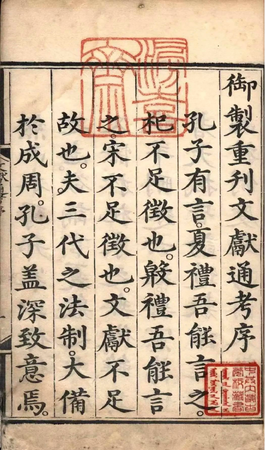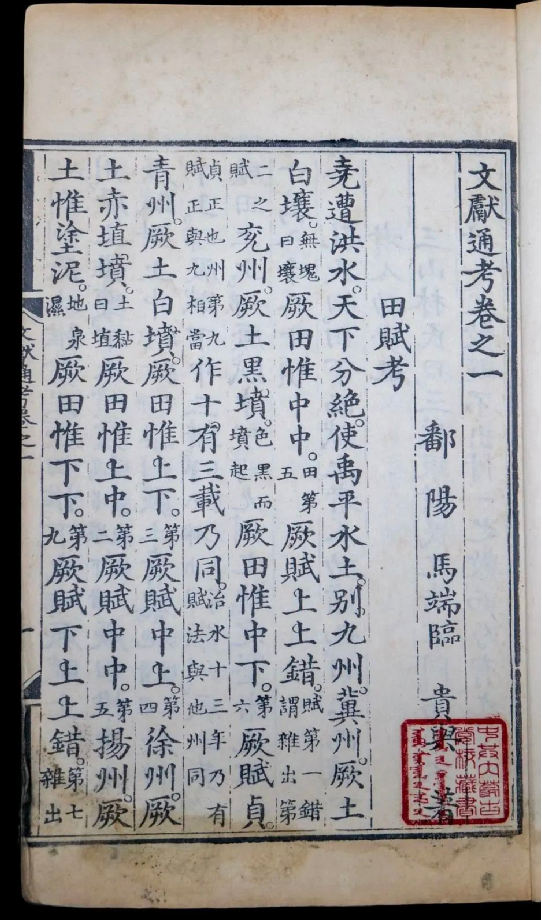 《文獻(xiàn)通考》所述歷代典章制度,上起上古,下至南宋寧宗嘉定末年。該書立目參照《通典》,并有所發(fā)展。全書分為二十四考,每一考前有小序,說明著述的成規(guī),考訂的新意,每考之下又分為若干子目,子目內(nèi)容皆按時(shí)間先后排列。撰寫體例是按文、獻(xiàn)、考三個(gè)層次排列,凡頂格排行者,即所謂“文”,也就是“敘事”部分。凡低一格排行者,即所謂的“獻(xiàn)”,也就是“論事”部分。凡低兩格排行者,即所謂“考”,也就是作者自己的議論,其內(nèi)容包括指點(diǎn)歷史演變的線索、評(píng)判是非、考辨史料和解釋名物等。
