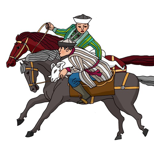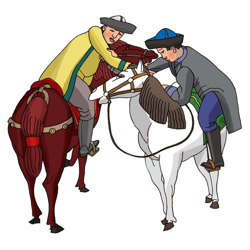 柯爾克孜族(馬上角力):柯爾克孜族有141549人,聚居在新疆克孜勒蘇柯爾克孜自治州??聽柨俗巫逯饕w育項目有賽馬、刁羊、摔跤、馬上角力、跑馬拾銀元、跑馬射元寶、月下尋物等。