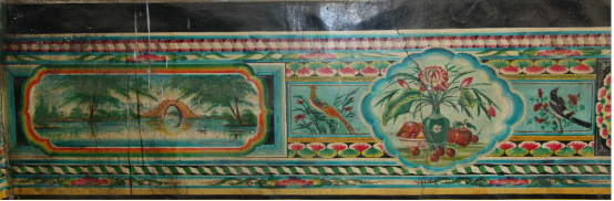 達拉特旗地區(qū)的墻圍畫高度一般在70厘米左右,其長度則依炕的大小而定??簧喜糠值漠嬍侵黧w,在結(jié)構(gòu)上有一套固定的模式,即以上下兩組邊道,按照一定的規(guī)格布置形成主體框架,中間等距離安排各種畫空,既具完整對稱的裝飾形式美感,又具簡繁對比、主從相映的豐富表現(xiàn)內(nèi)涵。邊道圖案種類繁多,有折子邊、卷帶邊、竹筒邊、花邊等。畫空也稱“池子”,有正方形、長方形、扇形、圓形等多種形式。此外,在下邊道與炕距離25-30厘米的范圍內(nèi)是黃顏色的邊子,這樣的設計是避免炕上物件的遮擋和抬高人的視線,便于觀賞。