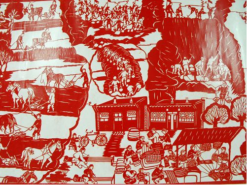 2、達(dá)拉特紀(jì)事剪紙的歷史價(jià)值很高,《農(nóng)民紀(jì)事圖》上卷記載了從建國(guó)到現(xiàn)在農(nóng)村的發(fā)展變化,在作品中我們看到了很多瀕臨失傳的農(nóng)村生產(chǎn)生活工具和生產(chǎn)方法,也能看到黨和國(guó)家在每一年出臺(tái)的各項(xiàng)惠農(nóng)利民政策,對(duì)于研究歷史具有重大的文獻(xiàn)價(jià)值。