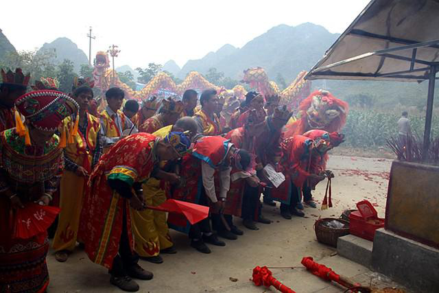 壯族霜降節(jié)頭降的早晨,先要在戲臺舉行隆重的酬謝活動。人們進行祭拜,從請神、求神到送神,將壯族美好和諧的祈愿寄托在美好的自然事物身上,以表達對自然之神的崇敬之情,表達祈盼五谷豐登的良好愿望。近年還增加了祈福長壽的內容。