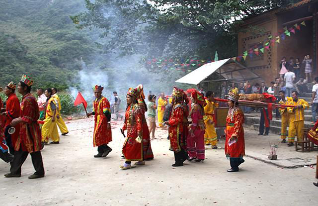 在酬謝自然之神后,由祭司念誦祭文,紀念民族英雄瓦氏夫人,頌揚瓦氏夫人率領將士打擊倭寇的英雄事跡,傳授民族歷史知識,宣揚保衛(wèi)家園、謀求平安的民族精神。