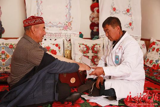居馬泰·俄白克多年的恩師阿吾爾達·合德爾現(xiàn)在也是他的病人,這位80多歲的老人向記者說道居馬泰·俄白克翻雪山、過冰河,無數(shù)次遇險,但他仍在堅持。把我們這些患者當作家人對待。學生時代的居馬泰·俄白克就是思想積極,熱心善良的好孩子。工作后獲得榮譽受到習總書記的接見,回到工作崗位上,很多牧民騎馬趕來看望他,他就利用這個機會向牧民宣傳黨的惠民政策、民族團結和健康保健等知識?!?/p>