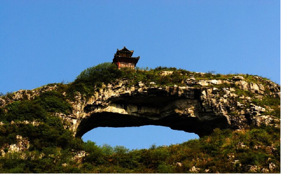 仙橋山位于貴州甕安縣城西南5公里的仙橋村,雄峙于南北伸展的長(zhǎng)嶺之巔。山頂有一長(zhǎng)方形穿洞,遠(yuǎn)望似一面中天明鏡,又若仕女發(fā)髻上的一匹玉簪。民間傳說,那高懸的“橋洞”,是神通廣大的仙人張三豐發(fā)怒時(shí)一拳擊穿的。站在“橋”下仰望“橋”頂,如巨粱橫亙天際,青崖黛壁,輝映云天。天衣無縫的“橋身”和兩邊的“橋墩”,渾然一體,構(gòu)成跨度約40米,寬20米,高約35米的“橋拱”?!皹蚬啊北泵娴摹皹蚨铡蹦_有形狀各異的石洞,曲徑相通。洞壁有形似人腳印石凹,傳說是仙人張三豐到此云游留下的足跡。