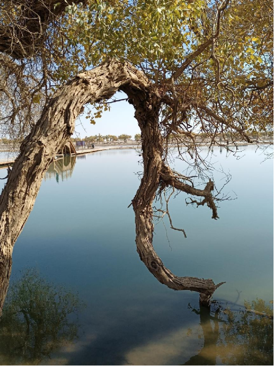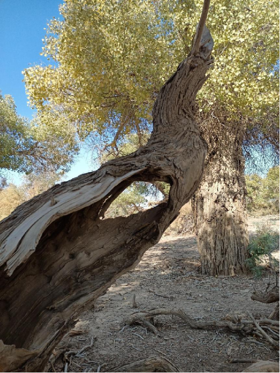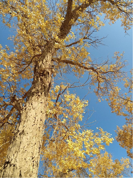 每當深秋季節(jié),胡楊樹葉變得一片金黃,形成胡楊秋色,樹影婆娑,奇妙絕倫,賞心悅目。漫步在濃郁的胡楊林中仿佛進入神話般的仙境。茂密的胡楊千奇百怪,神態(tài)萬般。粗壯的幾人難以合抱,挺拔的七、八丈之高,怪異的似蒼龍騰越,似虬蟠狂舞,令人驚奇不已,嘆為觀止。僅就密密匝匝的樹葉,也是風(fēng)采獨有。幼小的胡楊,葉片狹長而細小,宛若少女嫵媚的柳眉,人們常常把它誤認為柳樹;壯齡的胡楊,葉片又變成卵形、闊卵形或三角形,猶如興安嶺的白樺;進入老年期的胡楊,葉片才定型為橢圓形。更令人稱奇者,在同一棵胡楊樹冠的上下層次,還長著不同形狀的葉片,因此,又稱“異葉楊”