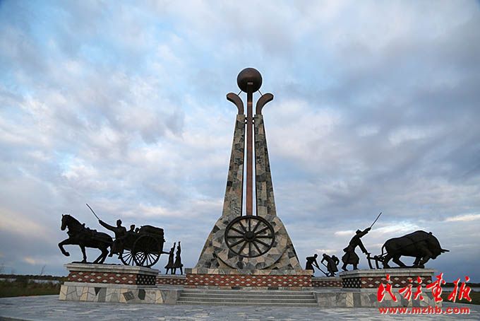 黑河市愛(ài)輝區(qū)坤河達(dá)斡爾族滿族鄉(xiāng)富拉爾基達(dá)斡爾族南遷廣場(chǎng)上的雕塑反映了達(dá)斡爾族在黑龍江畔開(kāi)墾土地,建設(shè)家園的情景。